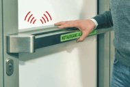 Im Überwachungszustand sichert die GfS e-Ba"® ein- und zweiflügelige Türen vor unbefugter Benutzung. Das weiß hinterlegte Sichtfenster mit der Aufschrift „Notausgang alarmgesichert" weist auf die Überwachung des Notausganges hin. Bei der verkabelten Variante ist das Sichtfenster dauerhaft grün hinterleuchtet..